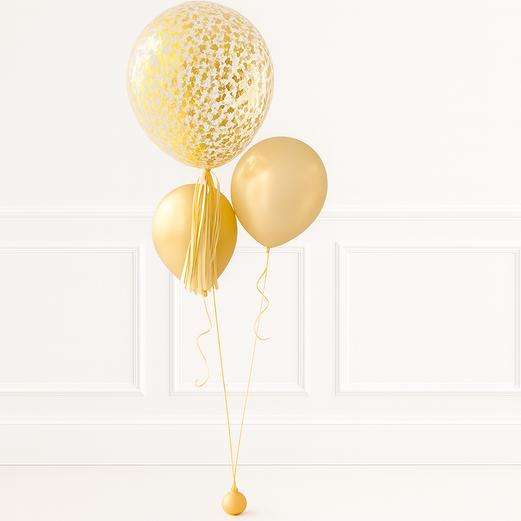 RIGHT: TRIO Medium Balloons with Tassels on Weight + Mini Air-Filled Foil [$95]